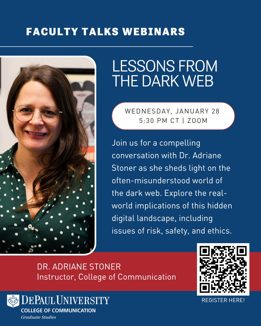 Join Dr. Adriane Stoner for a compelling conversation that demystifies the dark web and examines its very real implications for communication, technology, and society. This talk will explore how online anonymity shapes human behavior, what risks and vulnerabilities emerge in clandestine networks, and how ethical frameworks can guide us in navigating digital worlds that challenge our assumptions about privacy, safety, and accountability.